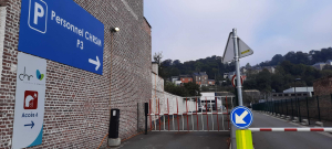 L’entrée de ce parking se trouve sur la gauche de l’hôpital avenue Albert 1er (photo en pièce jointe). La barrière sera relevée. Juste devant le parking P+R Saint-Nicolas. |