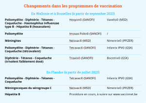 A partir du 1er septembre 2023 pour la Fédération Wallonie-Bruxelles et à partir du 1er juillet 2023 pour la Flandre, les produits fournis seront différents pour certains vaccins. Nous avons compilé ces changements en une seule infographie pour plus de clarté.