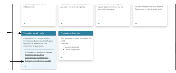 Vous pouvez retrouver les coordonnées du médecin du travail en vous rendant sur le site www.masante.belgique.be/#/, onglet « Travail et Santé », rubrique « Qui est mon médecin du travail ».