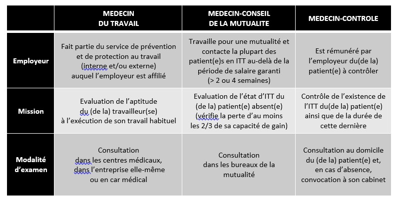 Attention à ne pas confondre le médecin du travail, le médecin-conseil de la mutualité et le médecin-contrôle.