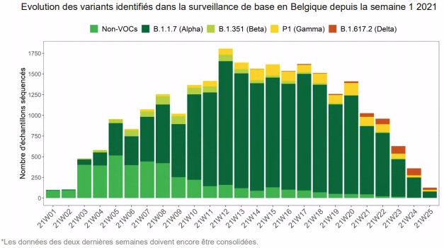La proportion du variant Delta est donc encore en augmentation, même si le nombre absolu de cas confirmés dus au variant Delta reste limité, le nombre d’infections étant toujours en diminution actuellement :