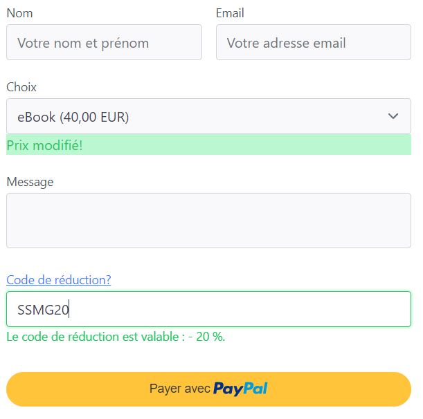 Cliquez dessus et saisissez-y le code suivant : SSMG20. Vous verrez immédiatement une réduction de 20% appliquée à votre total.